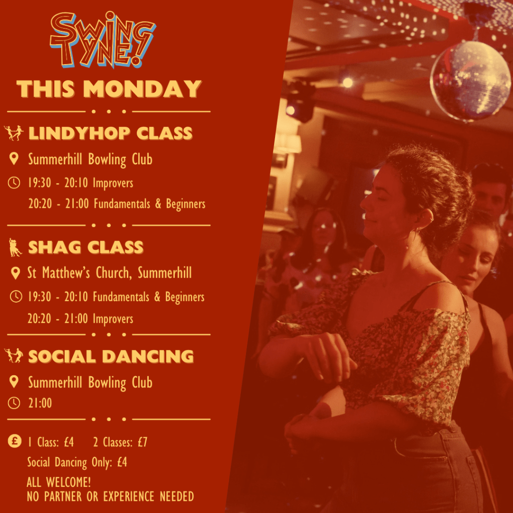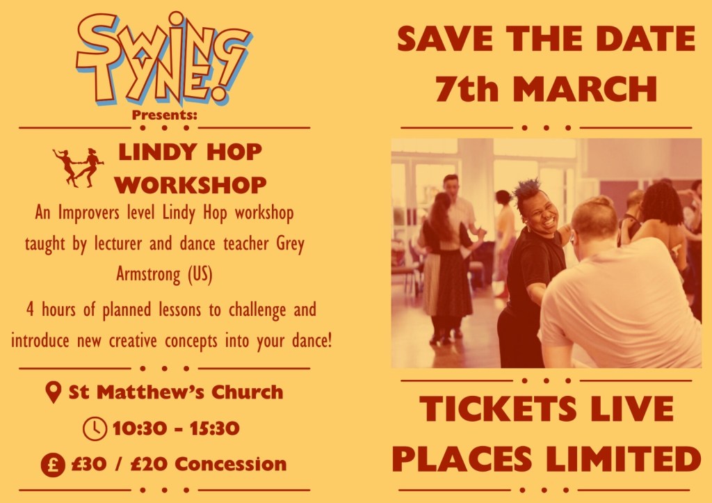 Tomorrow (the 7th) we have our Improver Lindy Hop Workshop, taught by Grey Armstrong. It’s perfect for dancers who already have the basics and are ready to challenge themselves a bit more. If you haven’t got a ticket yet, you can grab a last-minute one here: https://swingtyne.dancecloud.com/dance/39156